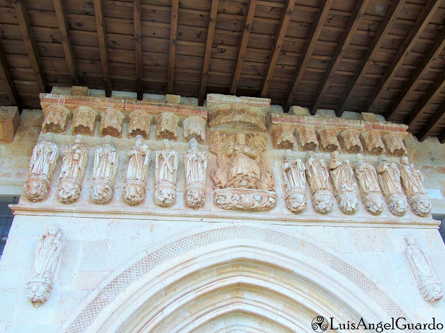 | Portada con cinco arquivoltas apuntadas bajo porche en el muro sur. Las cortas y gruesas columnas son ocho en total y sus capiteles -todos iguales- llevan esquemáticas hojas terminadas en volutas |